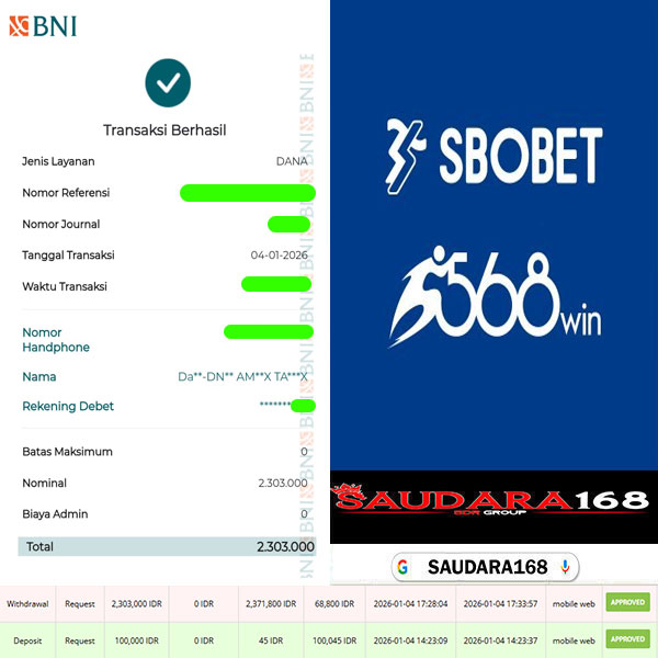 Selamat kepada User id : Jancxxxx Telah berhasil mendapatkan kemenangan besar pada permainan Sports SBOBET kemenangan Sebesar Rp.2.303.000, Setelah mengisi formulir withdraw dengan kurung waktu hanya 5 – 10 menit pihak Saudara168 sudah melakukan transfer kepada pemilik User id dan dana sudah dapat di cairkan oleh pemenang. Bukti pembayaran yang kami berikan merupakan bukti pembayaran yang SAH / VALID yang langsung di dapatkan melalui tanda transfer transaksi dari Bank yang di tuju.