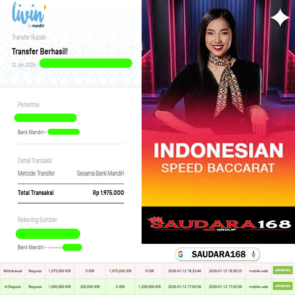 Selamat kepada User id : Hyugxxxx Telah berhasil mendapatkan kemenangan besar pada permainan LIVE CASINO INDONESIA SPEED BACCARAT kemenangan Sebesar Rp.1.975.000, Setelah mengisi formulir withdraw dengan kurung waktu hanya 5 – 10 menit pihak Saudara168 sudah melakukan transfer kepada pemilik User id dan dana sudah dapat di cairkan oleh pemenang. Bukti pembayaran yang kami berikan merupakan bukti pembayaran yang SAH / VALID yang langsung di dapatkan melalui tanda transfer transaksi dari Bank yang di tuju.