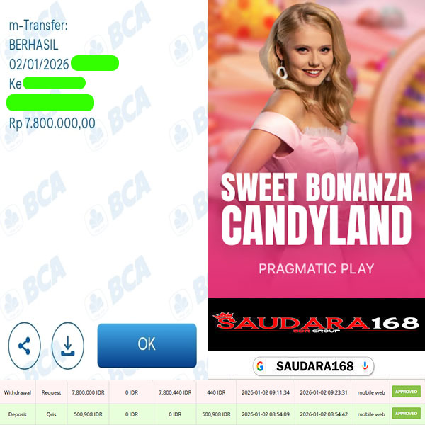 Selamat kepada User id : Saudxxxx Telah berhasil mendapatkan kemenangan besar pada permainan SLOT SWEET BONANZA CANDYLAND kemenangan Sebesar Rp.7.800.000, Setelah mengisi formulir withdraw dengan kurung waktu hanya 5 – 10 menit pihak Saudara168 sudah melakukan transfer kepada pemilik User id dan dana sudah dapat di cairkan oleh pemenang. Bukti pembayaran yang kami berikan merupakan bukti pembayaran yang SAH / VALID yang langsung di dapatkan melalui tanda transfer transaksi dari Bank yang di tuju.