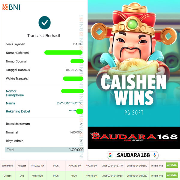 Selamat kepada User id : Kastxxxx Telah berhasil mendapatkan kemenangan besar pada permainan SLOT CAISHEN WINS kemenangan Sebesar Rp.1.410.000, Setelah mengisi formulir withdraw dengan kurung waktu hanya 5 – 10 menit pihak Saudara168 sudah melakukan transfer kepada pemilik User id dan dana sudah dapat di cairkan oleh pemenang. Bukti pembayaran yang kami berikan merupakan bukti pembayaran yang SAH / VALID yang langsung di dapatkan melalui tanda transfer transaksi dari Bank yang di tuju.