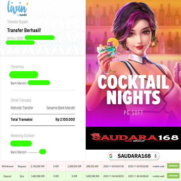 Selamat kepada User id : Agusxxxx Telah berhasil mendapatkan kemenangan besar pada permainan SLOT COCKTAIL NIGHTS kemenangan Sebesar Rp.2.100.000, Setelah mengisi formulir withdraw dengan kurung waktu hanya 5 – 10 menit pihak Saudara168 sudah melakukan transfer kepada pemilik User id dan dana sudah dapat di cairkan oleh pemenang. Bukti pembayaran yang kami berikan merupakan bukti pembayaran yang SAH / VALID yang langsung di dapatkan melalui tanda transfer transaksi dari Bank yang di tuju.