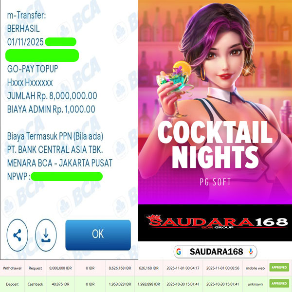 Selamat kepada User id : Tranxxxx Telah berhasil mendapatkan kemenangan besar pada permainan SLOT COCKTAIL NIGHTS kemenangan Sebesar Rp.8.000.000, Setelah mengisi formulir withdraw dengan kurung waktu hanya 5 – 10 menit pihak Saudara168 sudah melakukan transfer kepada pemilik User id dan dana sudah dapat di cairkan oleh pemenang. Bukti pembayaran yang kami berikan merupakan bukti pembayaran yang SAH / VALID yang langsung di dapatkan melalui tanda transfer transaksi dari Bank yang di tuju.