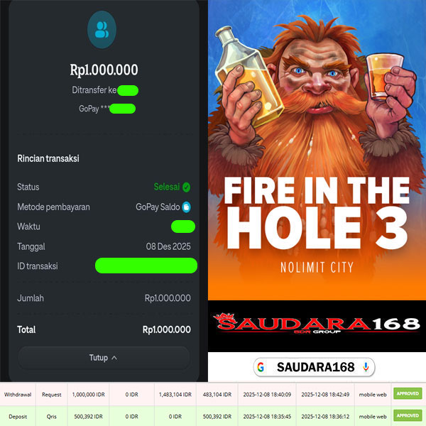 SAUDARA168 Bukti Kemenangan Slot Di Game FIRE IN THE HOLE 3 Rp.1.000.000.,- Lunas.
