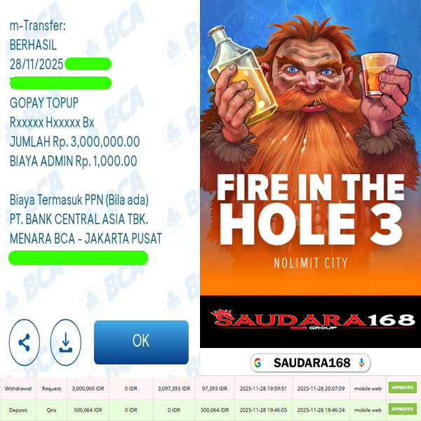 Selamat kepada User id : Zaynxxxx Telah berhasil mendapatkan kemenangan besar pada permainan SLOT FIRE IN THE HOLE 3 kemenangan Sebesar Rp.3.000.000, Setelah mengisi formulir withdraw dengan kurung waktu hanya 5 – 10 menit pihak Saudara168 sudah melakukan transfer kepada pemilik User id dan dana sudah dapat di cairkan oleh pemenang. Bukti pembayaran yang kami berikan merupakan bukti pembayaran yang SAH / VALID yang langsung di dapatkan melalui tanda transfer transaksi dari Bank yang di tuju.