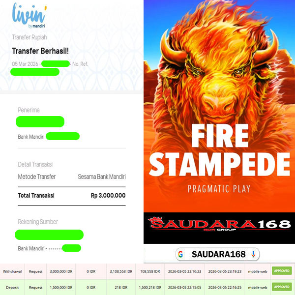 Selamat kepada User id : Hepixxxx Telah berhasil mendapatkan kemenangan besar pada permainan SLOT FIRE STAMPEDE kemenangan Sebesar Rp.3.000.000, Setelah mengisi formulir withdraw dengan kurung waktu hanya 5 – 10 menit pihak Saudara168 sudah melakukan transfer kepada pemilik User id dan dana sudah dapat di cairkan oleh pemenang. Bukti pembayaran yang kami berikan merupakan bukti pembayaran yang SAH / VALID yang langsung di dapatkan melalui tanda transfer transaksi dari Bank yang di tuju.