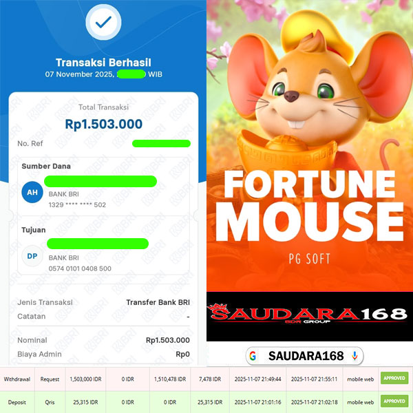 Selamat kepada User id : Theyxxxx Telah berhasil mendapatkan kemenangan besar pada permainan SLOT FORTUNE MOUSE kemenangan Sebesar Rp.1.503.000, Setelah mengisi formulir withdraw dengan kurung waktu hanya 5 – 10 menit pihak Saudara168 sudah melakukan transfer kepada pemilik User id dan dana sudah dapat di cairkan oleh pemenang. Bukti pembayaran yang kami berikan merupakan bukti pembayaran yang SAH / VALID yang langsung di dapatkan melalui tanda transfer transaksi dari Bank yang di tuju.