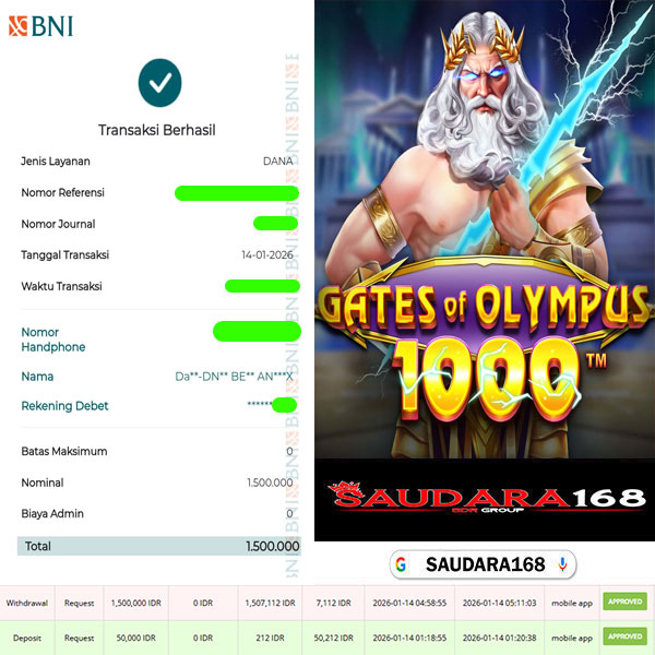 Selamat kepada User id : Benixxxx Telah berhasil mendapatkan kemenangan besar pada permainan SLOT GATES OF OLYMPUS 1000 kemenangan Sebesar Rp.1.500.000, Setelah mengisi formulir withdraw dengan kurung waktu hanya 5 – 10 menit pihak Saudara168 sudah melakukan transfer kepada pemilik User id dan dana sudah dapat di cairkan oleh pemenang. Bukti pembayaran yang kami berikan merupakan bukti pembayaran yang SAH / VALID yang langsung di dapatkan melalui tanda transfer transaksi dari Bank yang di tuju.