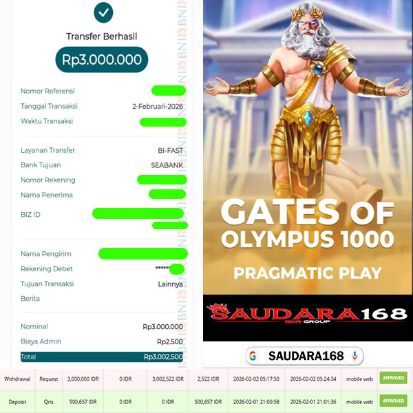 Selamat kepada User id : Nanuxxxx Telah berhasil mendapatkan kemenangan besar pada permainan SLOT GATES OF OLYMPUS 1000 kemenangan Sebesar Rp.3.000.000, Setelah mengisi formulir withdraw dengan kurung waktu hanya 5 – 10 menit pihak Saudara168 sudah melakukan transfer kepada pemilik User id dan dana sudah dapat di cairkan oleh pemenang. Bukti pembayaran yang kami berikan merupakan bukti pembayaran yang SAH / VALID yang langsung di dapatkan melalui tanda transfer transaksi dari Bank yang di tuju.