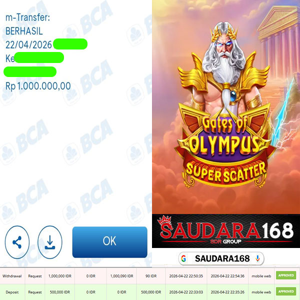 Selamat kepada User id : Masuxxxx Telah berhasil mendapatkan kemenangan besar pada permainan SLOT GATES OF OLYMPUS SUPER SCATTER kemenangan Sebesar Rp.1.000.000, Setelah mengisi formulir withdraw dengan kurung waktu hanya 5 – 10 menit pihak Saudara168 sudah melakukan transfer kepada pemilik User id dan dana sudah dapat di cairkan oleh pemenang. Bukti pembayaran yang kami berikan merupakan bukti pembayaran yang SAH / VALID yang langsung di dapatkan melalui tanda transfer transaksi dari Bank yang di tuju.
