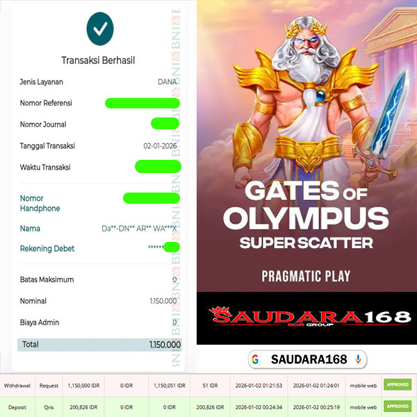 Selamat kepada User id : Santxxxx Telah berhasil mendapatkan kemenangan besar pada permainan SLOT GATES OF OLYMPUS SUPER SCATTER kemenangan Sebesar Rp.1.150.000, Setelah mengisi formulir withdraw dengan kurung waktu hanya 5 – 10 menit pihak Saudara168 sudah melakukan transfer kepada pemilik User id dan dana sudah dapat di cairkan oleh pemenang. Bukti pembayaran yang kami berikan merupakan bukti pembayaran yang SAH / VALID yang langsung di dapatkan melalui tanda transfer transaksi dari Bank yang di tuju.
