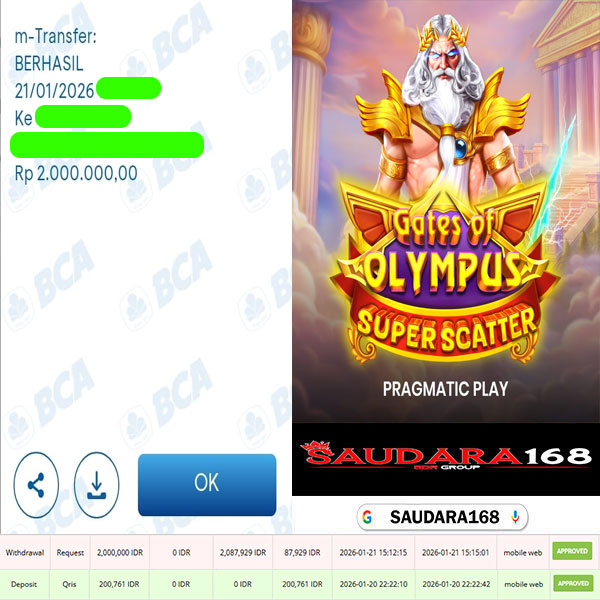 Selamat kepada User id : Pipixxxx Telah berhasil mendapatkan kemenangan besar pada permainan SLOT GATES OF OLYMPUS SUPER SCATTER kemenangan Sebesar Rp.2.000.000, Setelah mengisi formulir withdraw dengan kurung waktu hanya 5 – 10 menit pihak Saudara168 sudah melakukan transfer kepada pemilik User id dan dana sudah dapat di cairkan oleh pemenang. Bukti pembayaran yang kami berikan merupakan bukti pembayaran yang SAH / VALID yang langsung di dapatkan melalui tanda transfer transaksi dari Bank yang di tuju.
