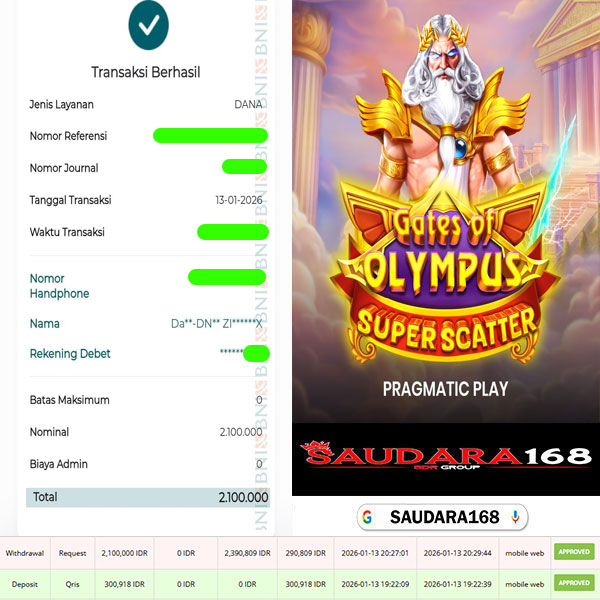 Selamat kepada User id : Ziraxxxx Telah berhasil mendapatkan kemenangan besar pada permainan SLOT GATES OF OLYMPUS SUPER SCATTER kemenangan Sebesar Rp.2.100.000, Setelah mengisi formulir withdraw dengan kurung waktu hanya 5 – 10 menit pihak Saudara168 sudah melakukan transfer kepada pemilik User id dan dana sudah dapat di cairkan oleh pemenang. Bukti pembayaran yang kami berikan merupakan bukti pembayaran yang SAH / VALID yang langsung di dapatkan melalui tanda transfer transaksi dari Bank yang di tuju.