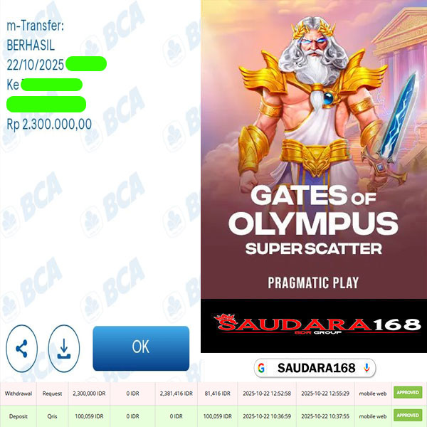 Selamat kepada User id : Nur1xxxx Telah berhasil mendapatkan kemenangan besar pada permainan SLOT GATES OF OLYMPUS SUPER SCATTER kemenangan Sebesar Rp.2.300.000, Setelah mengisi formulir withdraw dengan kurung waktu hanya 5 – 10 menit pihak Saudara168 sudah melakukan transfer kepada pemilik User id dan dana sudah dapat di cairkan oleh pemenang. Bukti pembayaran yang kami berikan merupakan bukti pembayaran yang SAH / VALID yang langsung di dapatkan melalui tanda transfer transaksi dari Bank yang di tuju.