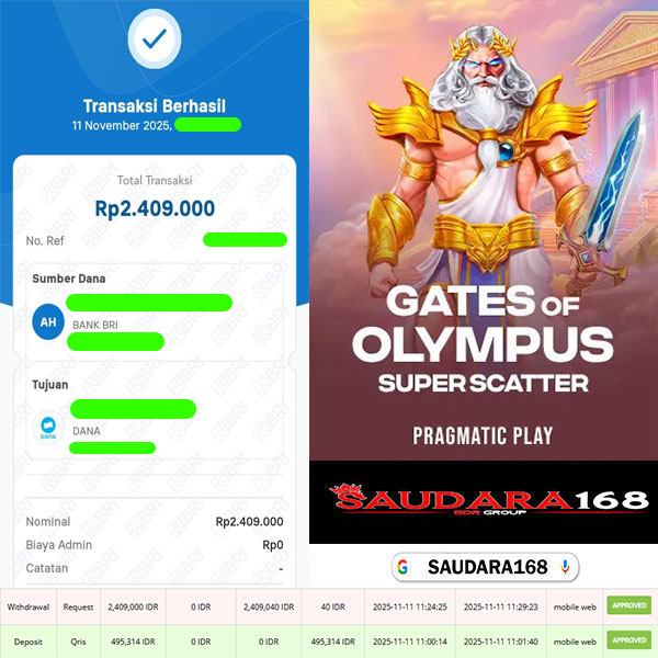 Selamat kepada User id : Borjxxxx Telah berhasil mendapatkan kemenangan besar pada permainan SLOT GATES OF OLYMPUS SUPER SCATTER kemenangan Sebesar Rp.2.409.000, Setelah mengisi formulir withdraw dengan kurung waktu hanya 5 – 10 menit pihak Saudara168 sudah melakukan transfer kepada pemilik User id dan dana sudah dapat di cairkan oleh pemenang. Bukti pembayaran yang kami berikan merupakan bukti pembayaran yang SAH / VALID yang langsung di dapatkan melalui tanda transfer transaksi dari Bank yang di tuju.