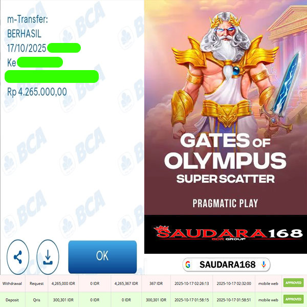 Selamat kepada User id : Jantxxxx Telah berhasil mendapatkan kemenangan besar pada permainan SLOT GATES OF OLYMPUS SUPER SCATTER kemenangan Sebesar Rp.4.265.000, Setelah mengisi formulir withdraw dengan kurung waktu hanya 5 – 10 menit pihak Saudara168 sudah melakukan transfer kepada pemilik User id dan dana sudah dapat di cairkan oleh pemenang. Bukti pembayaran yang kami berikan merupakan bukti pembayaran yang SAH / VALID yang langsung di dapatkan melalui tanda transfer transaksi dari Bank yang di tuju.