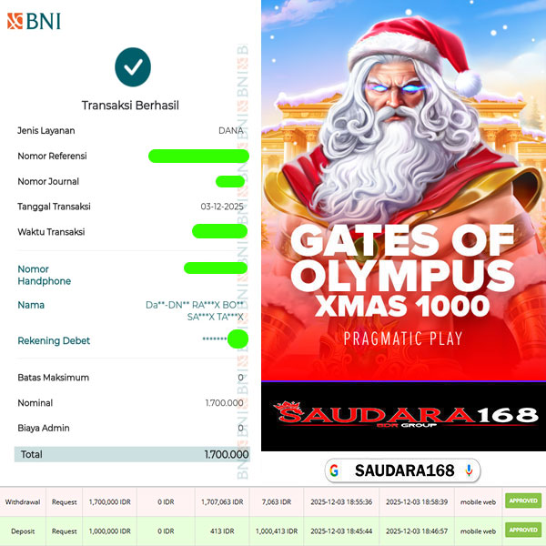 Selamat kepada User id : Rayxxxx Telah berhasil mendapatkan kemenangan besar pada permainan SLOT GATES OF OLYMPUS XMAS 1000 kemenangan Sebesar Rp.1.700.000, Setelah mengisi formulir withdraw dengan kurung waktu hanya 5 – 10 menit pihak Saudara168 sudah melakukan transfer kepada pemilik User id dan dana sudah dapat di cairkan oleh pemenang. Bukti pembayaran yang kami berikan merupakan bukti pembayaran yang SAH / VALID yang langsung di dapatkan melalui tanda transfer transaksi dari Bank yang di tuju.