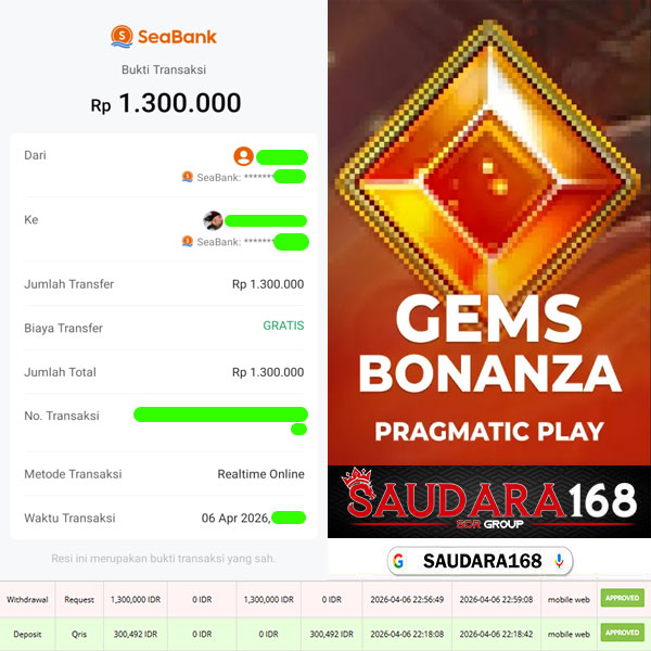 Selamat kepada User id : Ritaxxxx Telah berhasil mendapatkan kemenangan besar pada permainan SLOT GEMS BONANZA kemenangan Sebesar Rp.1.300.000, Setelah mengisi formulir withdraw dengan kurung waktu hanya 5 – 10 menit pihak Saudara168 sudah melakukan transfer kepada pemilik User id dan dana sudah dapat di cairkan oleh pemenang. Bukti pembayaran yang kami berikan merupakan bukti pembayaran yang SAH / VALID yang langsung di dapatkan melalui tanda transfer transaksi dari Bank yang di tuju.
