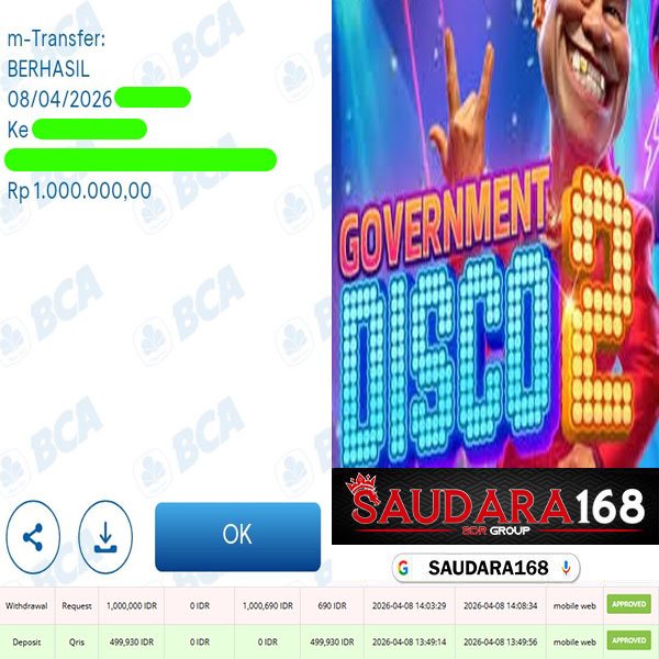 Selamat kepada User id : Ariexxxx Telah berhasil mendapatkan kemenangan besar pada permainan SLOT GOVERNMENT DISCO 2 kemenangan Sebesar Rp.1.000.000, Setelah mengisi formulir withdraw dengan kurung waktu hanya 5 – 10 menit pihak Saudara168 sudah melakukan transfer kepada pemilik User id dan dana sudah dapat di cairkan oleh pemenang. Bukti pembayaran yang kami berikan merupakan bukti pembayaran yang SAH / VALID yang langsung di dapatkan melalui tanda transfer transaksi dari Bank yang di tuju.