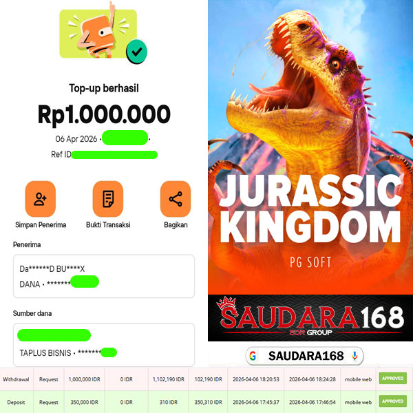 SAUDARA168 Bukti Kemenangan Slot Di Game JURASSIC KINGDOM Rp.1.000.000.,- Lunas.