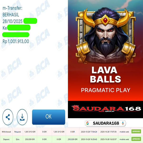 SAUDARA168 Bukti Kemenangan Slot Di Game LAVA BALLS Rp.1.001.913.,- Lunas.