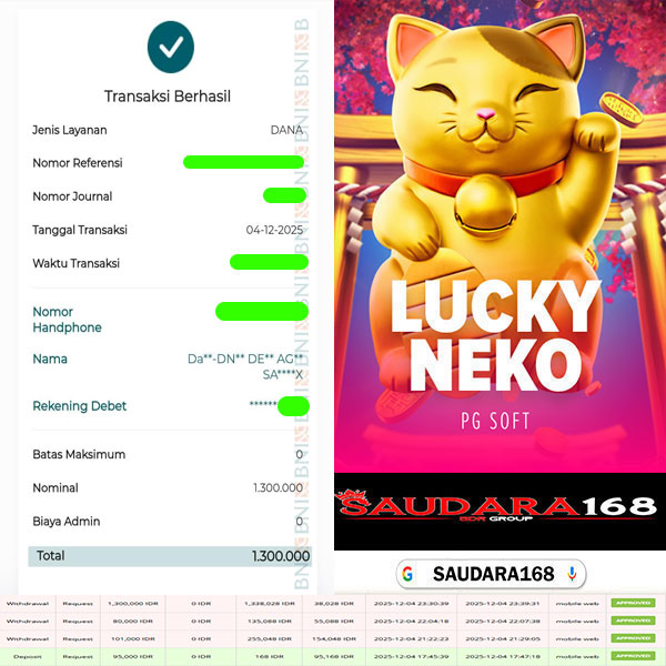 Selamat kepada User id : Dekixxxx Telah berhasil mendapatkan kemenangan besar pada permainan SLOT LUCKY NEKO kemenangan Sebesar Rp.1.481.000, Setelah mengisi formulir withdraw dengan kurung waktu hanya 5 – 10 menit pihak Saudara168 sudah melakukan transfer kepada pemilik User id dan dana sudah dapat di cairkan oleh pemenang. Bukti pembayaran yang kami berikan merupakan bukti pembayaran yang SAH / VALID yang langsung di dapatkan melalui tanda transfer transaksi dari Bank yang di tuju.