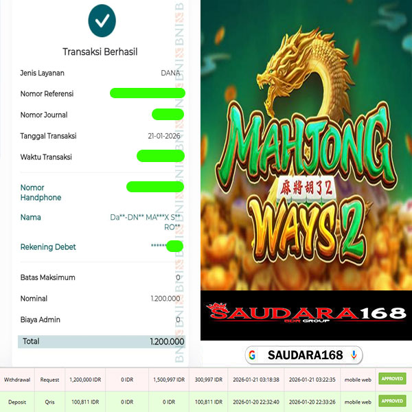 Selamat kepada User id : Ronixxxx Telah berhasil mendapatkan kemenangan besar pada permainan SLOT MAHJONG WAYS 2 kemenangan Sebesar Rp.1.200.000, Setelah mengisi formulir withdraw dengan kurung waktu hanya 5 – 10 menit pihak Saudara168 sudah melakukan transfer kepada pemilik User id dan dana sudah dapat di cairkan oleh pemenang. Bukti pembayaran yang kami berikan merupakan bukti pembayaran yang SAH / VALID yang langsung di dapatkan melalui tanda transfer transaksi dari Bank yang di tuju.