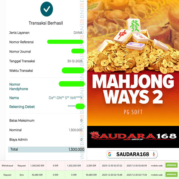 Selamat kepada User id : Sriwxxxx Telah berhasil mendapatkan kemenangan besar pada permainan SLOT MAHJONG WAYS 2 kemenangan Sebesar Rp.1.300.000, Setelah mengisi formulir withdraw dengan kurung waktu hanya 5 – 10 menit pihak Saudara168 sudah melakukan transfer kepada pemilik User id dan dana sudah dapat di cairkan oleh pemenang. Bukti pembayaran yang kami berikan merupakan bukti pembayaran yang SAH / VALID yang langsung di dapatkan melalui tanda transfer transaksi dari Bank yang di tuju.