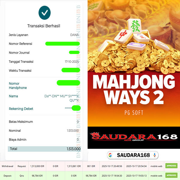 Selamat kepada User id : Ubosxxxx Telah berhasil mendapatkan kemenangan besar pada permainan SLOT MAHJONG WAYS 2 kemenangan Sebesar Rp.1.513.000, Setelah mengisi formulir withdraw dengan kurung waktu hanya 5 – 10 menit pihak Saudara168 sudah melakukan transfer kepada pemilik User id dan dana sudah dapat di cairkan oleh pemenang. Bukti pembayaran yang kami berikan merupakan bukti pembayaran yang SAH / VALID yang langsung di dapatkan melalui tanda transfer transaksi dari Bank yang di tuju.