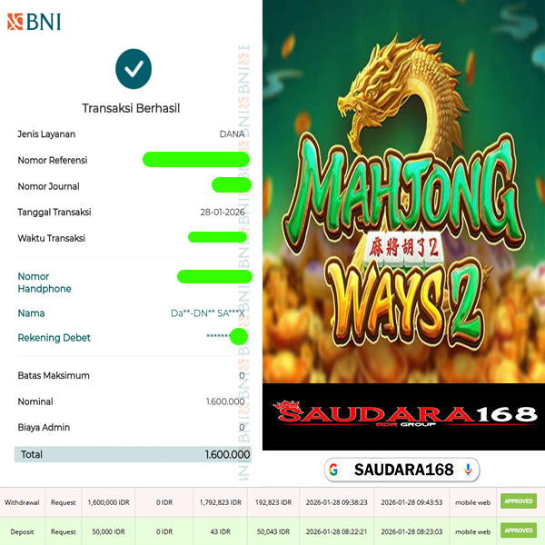 Selamat kepada User id : Sahtxxxx Telah berhasil mendapatkan kemenangan besar pada permainan SLOT MAHJONG WAYS 2 kemenangan Sebesar Rp.1.600.000, Setelah mengisi formulir withdraw dengan kurung waktu hanya 5 – 10 menit pihak Saudara168 sudah melakukan transfer kepada pemilik User id dan dana sudah dapat di cairkan oleh pemenang. Bukti pembayaran yang kami berikan merupakan bukti pembayaran yang SAH / VALID yang langsung di dapatkan melalui tanda transfer transaksi dari Bank yang di tuju.