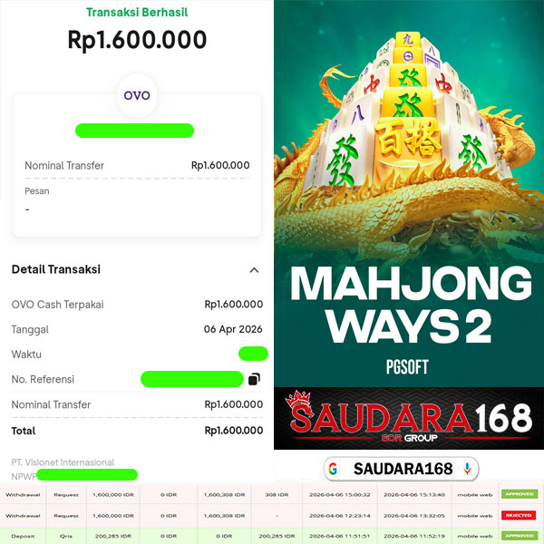 SAUDARA168 Bukti Kemenangan Slot Di Game MAHJONG WAYS 2 Rp.1.600.000.,- Lunas.