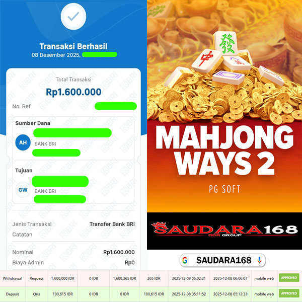 Selamat kepada User id : Aynkxxxx Telah berhasil mendapatkan kemenangan besar pada permainan SLOT MAHJONG WAYS 2 kemenangan Sebesar Rp.1.600.000, Setelah mengisi formulir withdraw dengan kurung waktu hanya 5 – 10 menit pihak Saudara168 sudah melakukan transfer kepada pemilik User id dan dana sudah dapat di cairkan oleh pemenang. Bukti pembayaran yang kami berikan merupakan bukti pembayaran yang SAH / VALID yang langsung di dapatkan melalui tanda transfer transaksi dari Bank yang di tuju.