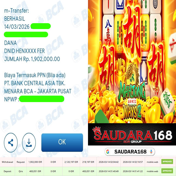 Selamat kepada User id : Junaxxxx Telah berhasil mendapatkan kemenangan besar pada permainan SLOT MAHJONG WAYS 2 kemenangan Sebesar Rp.1.902.000, Setelah mengisi formulir withdraw dengan kurung waktu hanya 5 – 10 menit pihak Saudara168 sudah melakukan transfer kepada pemilik User id dan dana sudah dapat di cairkan oleh pemenang. Bukti pembayaran yang kami berikan merupakan bukti pembayaran yang SAH / VALID yang langsung di dapatkan melalui tanda transfer transaksi dari Bank yang di tuju.