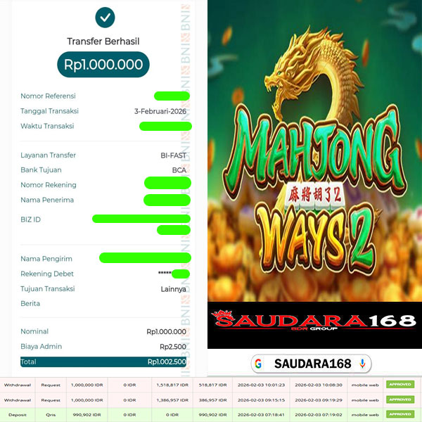 Selamat kepada User id : Noerxxxx Telah berhasil mendapatkan kemenangan besar pada permainan SLOT MAHJONG WAYS 2 kemenangan Sebesar Rp.2.000.000, Setelah mengisi formulir withdraw dengan kurung waktu hanya 5 – 10 menit pihak Saudara168 sudah melakukan transfer kepada pemilik User id dan dana sudah dapat di cairkan oleh pemenang. Bukti pembayaran yang kami berikan merupakan bukti pembayaran yang SAH / VALID yang langsung di dapatkan melalui tanda transfer transaksi dari Bank yang di tuju.