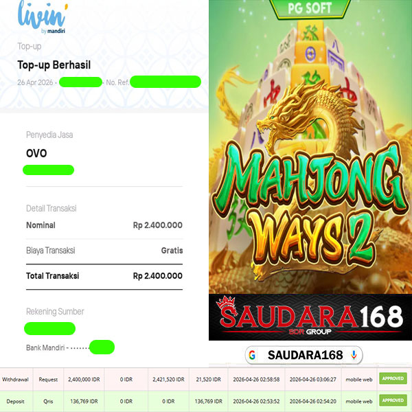 Selamat kepada User id : Botrxxxx Telah berhasil mendapatkan kemenangan besar pada permainan SLOT MAHJONG WAYS 2 kemenangan Sebesar Rp.2.400.000, Setelah mengisi formulir withdraw dengan kurung waktu hanya 5 – 10 menit pihak Saudara168 sudah melakukan transfer kepada pemilik User id dan dana sudah dapat di cairkan oleh pemenang. Bukti pembayaran yang kami berikan merupakan bukti pembayaran yang SAH / VALID yang langsung di dapatkan melalui tanda transfer transaksi dari Bank yang di tuju.