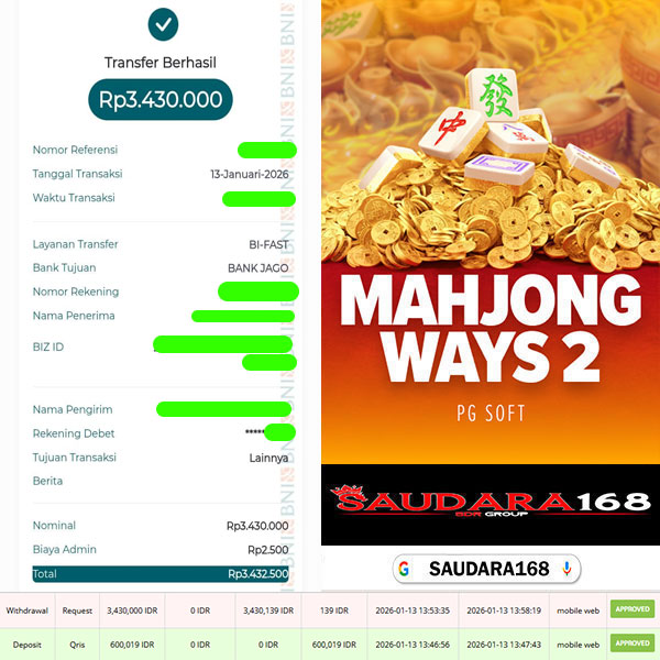 Selamat kepada User id : Totoxxxx Telah berhasil mendapatkan kemenangan besar pada permainan SLOT MAHJONG WAYS 2 kemenangan Sebesar Rp.3.430.000, Setelah mengisi formulir withdraw dengan kurung waktu hanya 5 – 10 menit pihak Saudara168 sudah melakukan transfer kepada pemilik User id dan dana sudah dapat di cairkan oleh pemenang. Bukti pembayaran yang kami berikan merupakan bukti pembayaran yang SAH / VALID yang langsung di dapatkan melalui tanda transfer transaksi dari Bank yang di tuju.
