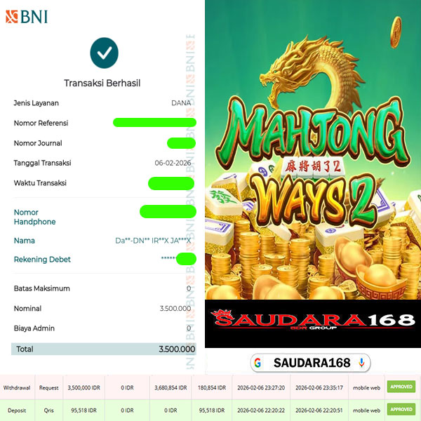 Selamat kepada User id : Irwaxxxx Telah berhasil mendapatkan kemenangan besar pada permainan SLOT MAHJONG WAYS 2 kemenangan Sebesar Rp.3.500.000, Setelah mengisi formulir withdraw dengan kurung waktu hanya 5 – 10 menit pihak Saudara168 sudah melakukan transfer kepada pemilik User id dan dana sudah dapat di cairkan oleh pemenang. Bukti pembayaran yang kami berikan merupakan bukti pembayaran yang SAH / VALID yang langsung di dapatkan melalui tanda transfer transaksi dari Bank yang di tuju.