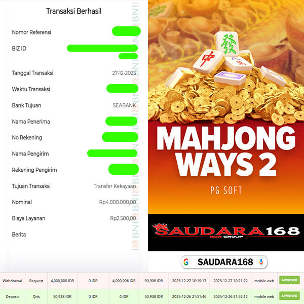 Selamat kepada User id : Munaxxxx Telah berhasil mendapatkan kemenangan besar pada permainan SLOT MAHJONG WAYS 2 kemenangan Sebesar Rp.4.000.000, Setelah mengisi formulir withdraw dengan kurung waktu hanya 5 – 10 menit pihak Saudara168 sudah melakukan transfer kepada pemilik User id dan dana sudah dapat di cairkan oleh pemenang. Bukti pembayaran yang kami berikan merupakan bukti pembayaran yang SAH / VALID yang langsung di dapatkan melalui tanda transfer transaksi dari Bank yang di tuju.