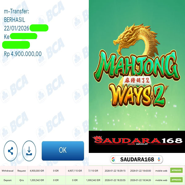 Selamat kepada User id : Nunuxxxx Telah berhasil mendapatkan kemenangan besar pada permainan SLOT MAHJONG WAYS 2 kemenangan Sebesar Rp.4.900.000, Setelah mengisi formulir withdraw dengan kurung waktu hanya 5 – 10 menit pihak Saudara168 sudah melakukan transfer kepada pemilik User id dan dana sudah dapat di cairkan oleh pemenang. Bukti pembayaran yang kami berikan merupakan bukti pembayaran yang SAH / VALID yang langsung di dapatkan melalui tanda transfer transaksi dari Bank yang di tuju.