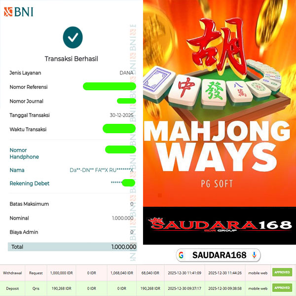 Selamat kepada User id : Satrxxxx Telah berhasil mendapatkan kemenangan besar pada permainan SLOT MAHJONG WAYS kemenangan Sebesar Rp.1.000.000, Setelah mengisi formulir withdraw dengan kurung waktu hanya 5 – 10 menit pihak Saudara168 sudah melakukan transfer kepada pemilik User id dan dana sudah dapat di cairkan oleh pemenang. Bukti pembayaran yang kami berikan merupakan bukti pembayaran yang SAH / VALID yang langsung di dapatkan melalui tanda transfer transaksi dari Bank yang di tuju.
