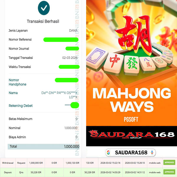 Selamat kepada User id : Lingxxxx Telah berhasil mendapatkan kemenangan besar pada permainan SLOT MAHJONG WAYS kemenangan Sebesar Rp.1.000.000, Setelah mengisi formulir withdraw dengan kurung waktu hanya 5 – 10 menit pihak Saudara168 sudah melakukan transfer kepada pemilik User id dan dana sudah dapat di cairkan oleh pemenang. Bukti pembayaran yang kami berikan merupakan bukti pembayaran yang SAH / VALID yang langsung di dapatkan melalui tanda transfer transaksi dari Bank yang di tuju.