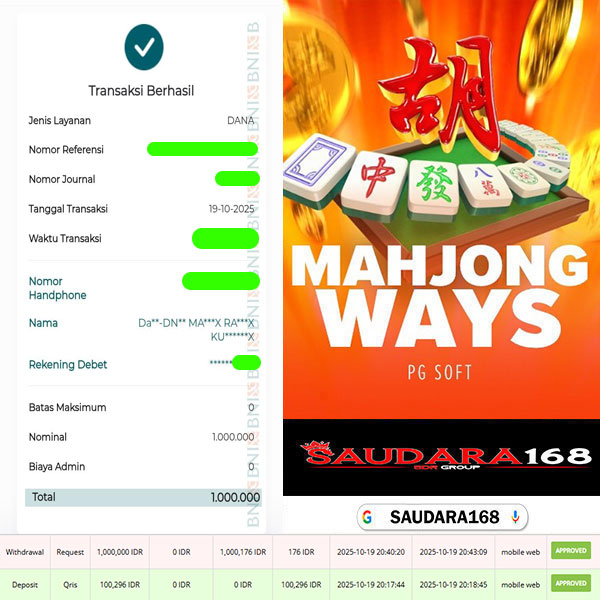 Selamat kepada User id : Mattxxxx Telah berhasil mendapatkan kemenangan besar pada permainan SLOT MAHJONG WAYS kemenangan Sebesar Rp.1.000.000, Setelah mengisi formulir withdraw dengan kurung waktu hanya 5 – 10 menit pihak Saudara168 sudah melakukan transfer kepada pemilik User id dan dana sudah dapat di cairkan oleh pemenang. Bukti pembayaran yang kami berikan merupakan bukti pembayaran yang SAH / VALID yang langsung di dapatkan melalui tanda transfer transaksi dari Bank yang di tuju.