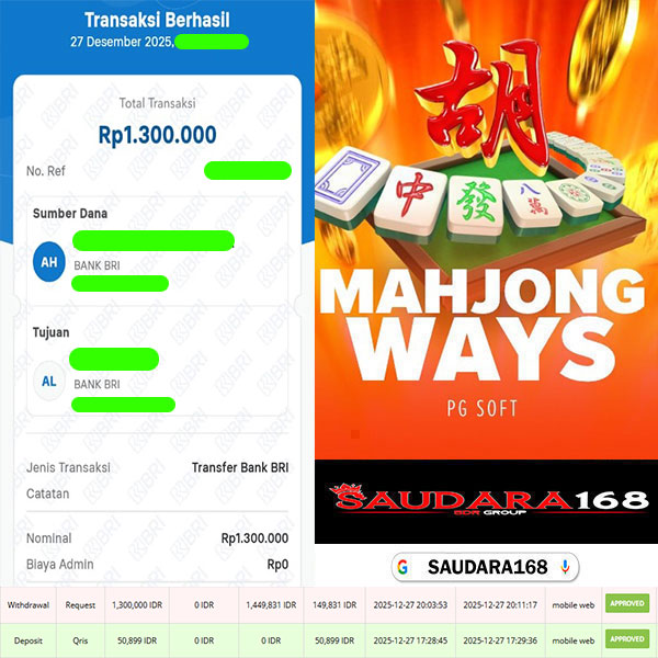 Selamat kepada User id : Budixxxx Telah berhasil mendapatkan kemenangan besar pada permainan SLOT MAHJONG WAYS kemenangan Sebesar Rp.1.300.000, Setelah mengisi formulir withdraw dengan kurung waktu hanya 5 – 10 menit pihak Saudara168 sudah melakukan transfer kepada pemilik User id dan dana sudah dapat di cairkan oleh pemenang. Bukti pembayaran yang kami berikan merupakan bukti pembayaran yang SAH / VALID yang langsung di dapatkan melalui tanda transfer transaksi dari Bank yang di tuju.