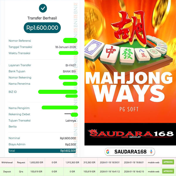Selamat kepada User id : Safixxxx Telah berhasil mendapatkan kemenangan besar pada permainan SLOT MAHJONG WAYS kemenangan Sebesar Rp.1.600.000, Setelah mengisi formulir withdraw dengan kurung waktu hanya 5 – 10 menit pihak Saudara168 sudah melakukan transfer kepada pemilik User id dan dana sudah dapat di cairkan oleh pemenang. Bukti pembayaran yang kami berikan merupakan bukti pembayaran yang SAH / VALID yang langsung di dapatkan melalui tanda transfer transaksi dari Bank yang di tuju.