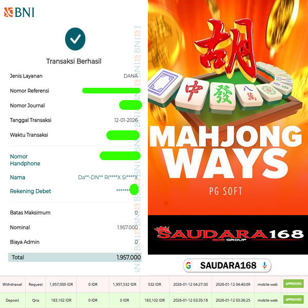 Selamat kepada User id : Bataxxxx Telah berhasil mendapatkan kemenangan besar pada permainan SLOT MAHJONG WAYS kemenangan Sebesar Rp.1.957.000, Setelah mengisi formulir withdraw dengan kurung waktu hanya 5 – 10 menit pihak Saudara168 sudah melakukan transfer kepada pemilik User id dan dana sudah dapat di cairkan oleh pemenang. Bukti pembayaran yang kami berikan merupakan bukti pembayaran yang SAH / VALID yang langsung di dapatkan melalui tanda transfer transaksi dari Bank yang di tuju.