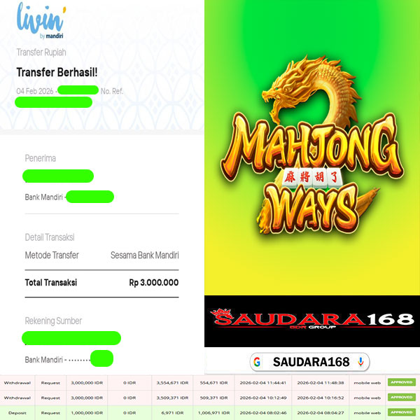 Selamat kepada User id : Hepixxxx Telah berhasil mendapatkan kemenangan besar pada permainan SLOT MAHJONG WAYS kemenangan Sebesar Rp.6.000.000, Setelah mengisi formulir withdraw dengan kurung waktu hanya 5 – 10 menit pihak Saudara168 sudah melakukan transfer kepada pemilik User id dan dana sudah dapat di cairkan oleh pemenang. Bukti pembayaran yang kami berikan merupakan bukti pembayaran yang SAH / VALID yang langsung di dapatkan melalui tanda transfer transaksi dari Bank yang di tuju.