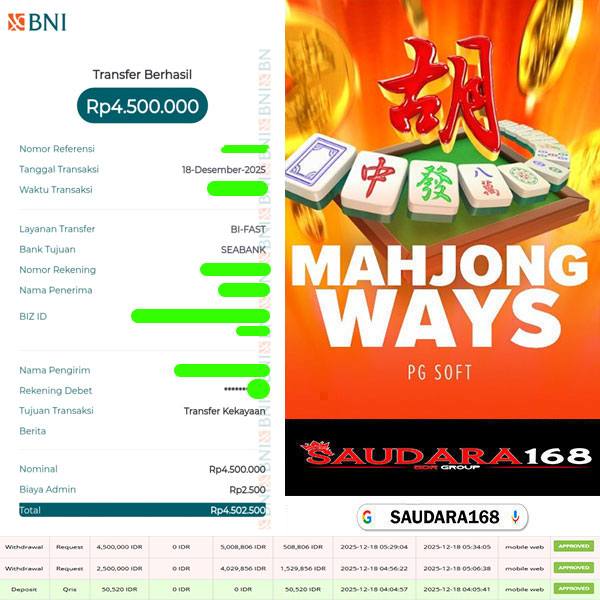 Selamat kepada User id : Labuxxxx Telah berhasil mendapatkan kemenangan besar pada permainan SLOT MAHJONG WAYS kemenangan Sebesar Rp.7.000.000, Setelah mengisi formulir withdraw dengan kurung waktu hanya 5 – 10 menit pihak Saudara168 sudah melakukan transfer kepada pemilik User id dan dana sudah dapat di cairkan oleh pemenang. Bukti pembayaran yang kami berikan merupakan bukti pembayaran yang SAH / VALID yang langsung di dapatkan melalui tanda transfer transaksi dari Bank yang di tuju.