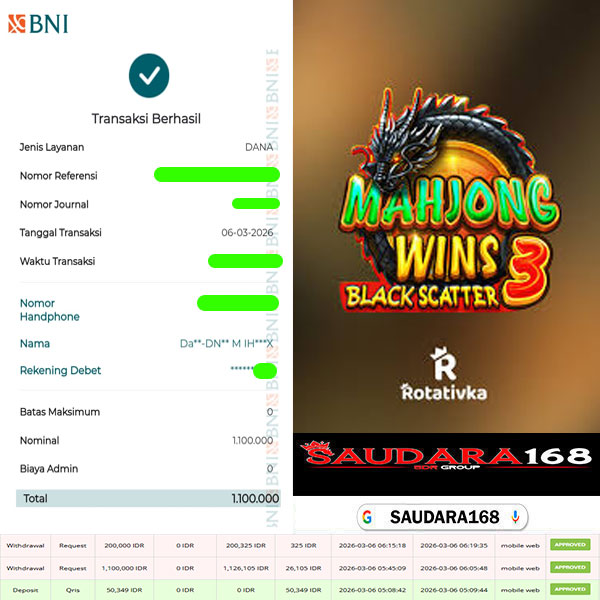 Selamat kepada User id : Adinxxxx Telah berhasil mendapatkan kemenangan besar pada permainan Game Slot MAHJONG WINS 3 BLACK SCATTER kemenangan Sebesar Rp.1.300.000, Setelah mengisi formulir withdraw dengan kurung waktu hanya 5 – 10 menit pihak Saudara168 sudah melakukan transfer kepada pemilik User id dan dana sudah dapat di cairkan oleh pemenang. Bukti pembayaran yang kami berikan merupakan bukti pembayaran yang SAH / VALID yang langsung di dapatkan melalui tanda transfer transaksi dari Bank yang di tuju.