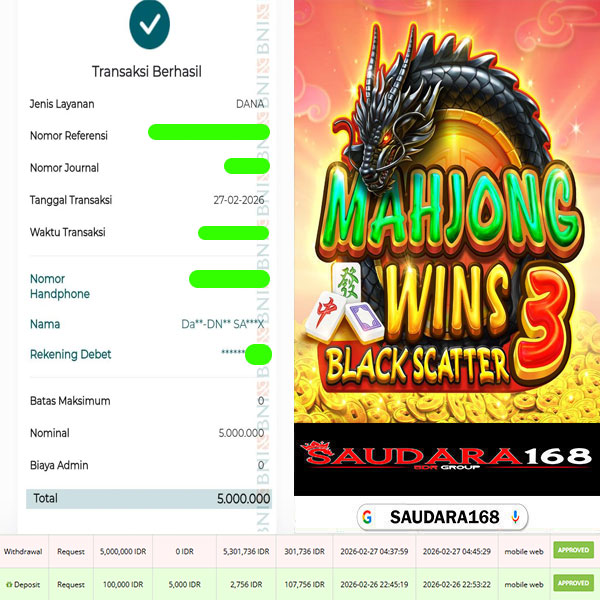 Selamat kepada User id :Aweixxxx Telah berhasil mendapatkan kemenangan besar pada permainan Game Slot MAHJONG WINS 3 BLACK SCATTER kemenangan Sebesar Rp.5.000.000, Setelah mengisi formulir withdraw dengan kurung waktu hanya 5 – 10 menit pihak Saudara168 sudah melakukan transfer kepada pemilik User id dan dana sudah dapat di cairkan oleh pemenang. Bukti pembayaran yang kami berikan merupakan bukti pembayaran yang SAH / VALID yang langsung di dapatkan melalui tanda transfer transaksi dari Bank yang di tuju.