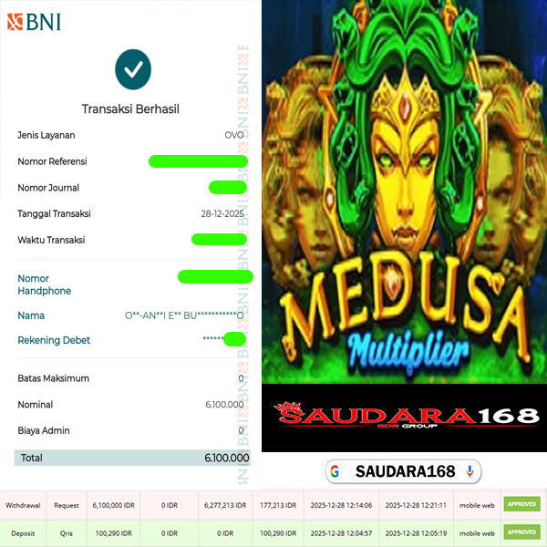 Selamat kepada User id : Poloxxxx Telah berhasil mendapatkan kemenangan besar pada permainan SLOT MEDUSA MULTIPLIER kemenangan Sebesar Rp.6.100.000, Setelah mengisi formulir withdraw dengan kurung waktu hanya 5 – 10 menit pihak Saudara168 sudah melakukan transfer kepada pemilik User id dan dana sudah dapat di cairkan oleh pemenang. Bukti pembayaran yang kami berikan merupakan bukti pembayaran yang SAH / VALID yang langsung di dapatkan melalui tanda transfer transaksi dari Bank yang di tuju.