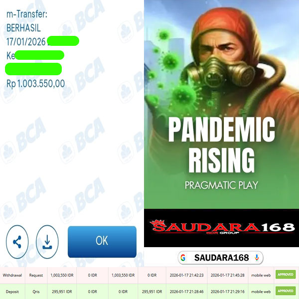 Selamat kepada User id : Ritaxxxx Telah berhasil mendapatkan kemenangan besar pada permainan SLOT PANDEMIC RISING kemenangan Sebesar Rp.1.003.550, Setelah mengisi formulir withdraw dengan kurung waktu hanya 5 – 10 menit pihak Saudara168 sudah melakukan transfer kepada pemilik User id dan dana sudah dapat di cairkan oleh pemenang. Bukti pembayaran yang kami berikan merupakan bukti pembayaran yang SAH / VALID yang langsung di dapatkan melalui tanda transfer transaksi dari Bank yang di tuju.